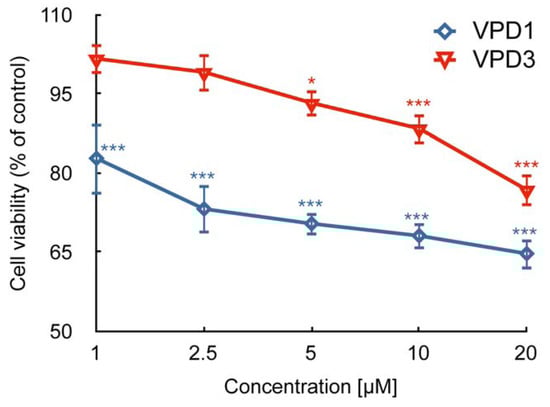Cell viability of mHippoE-18 cells after 24 h treatment with VPDs (n = 5, * p < 0.05, ** p < 0.01, *** p < 0.001). Statistical differences occur for VPD1 between concentrations 1 and 2.5–20 μM, 2.5 and 20 μM, and for VPD3 between 1 and 5–20 μM, 2.5 and 10–20 μM, 5 and 20 μM, as well as 10 and 20 μM. Moreover, there are statistical differences between the two dendrimers at all tested concentrations.