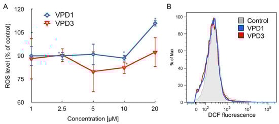 Alterations in the level of reactive oxygen species (ROS) after 24 h exposure of mHippoE-18 cells to VPDs (A) (n = 3, * p < 0.05). H2O2 was used as a positive control (133.02 ± 12.63 *). (B) is a representative histogram showing DCF fluorescence intensity in the control and samples treated with 10 μM of VPDs. There is a statistical difference for VPD1 between concentrations 10 and 20 μM.