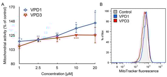 For MTT, H2DCFDA, CM-H2TMRos, JC-1, and GSH assays the results were calculated relatively to untreated cells (100%) and differences between the control and the treated samples were evaluated using one-sample t-test, where p < 0.05 and below was accepted as statistically significant. For YO-PRO-1/PI, cell cycle, and CAT activity assays the differences between the control and the treated samples were evaluated using Student’s t-test, where p < 0.05 and below was accepted as statistically significant. For comparison between VPD1 and VPD3 and concentrations of the same VPD one-way ANOVA was performed followed by Tukey’s multiple comparison test. Data were presented as a mean ± SD of three to five individual experiments.