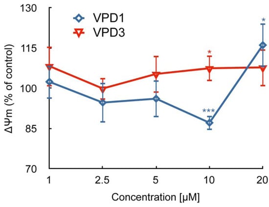 Moreover, VPDs treatment for a mHipppoE-18 cell line caused perturbations in ΔΨm. In the case of VPD1 ΔΨm decreased to 87.13% of control at the concentration of 10 μM, while 20 μM caused small hyperpolarisation of the mitochondrial membrane (116.08% of control). VPD3 treatment led to the slight increase in ΔΨm, to 107.45% of control (Figure 5).