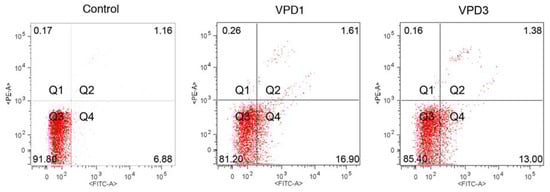 Representative dot plots showing fractions of healthy (Q3), apoptotic (Q4), and dead (Q1 and Q2) cells after 24 h exposure to 20 μM of VPDs.