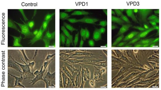 Fluorescence/phase contrast microscopy analyses of mHippoE-18 cells after 24 h exposure to 20 μM of VPDs. Magnification 400×.