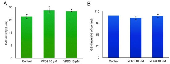 Catalase (CAT) activity (A) and level of reduced glutathione (GSH) (B) in mHippoE-18 cells after 24 h exposure to 10 μM of VPDs.