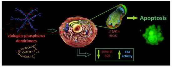 In light of recent findings that VPDs possess the ability to inhibit neurodegenerative processes in vitro, associated with, for instance, Alzheimer’s and Parkinson’s diseases [23,64,65] and the lack of data on the influence of these phosphorus dendrimers on neural cells, we aimed our research at studying the impact of two VPDs on the mouse hippocampal cell line. In this work, we demonstrated that tested VPDs are low-toxic to mouse mHippoE-18 cell line, and VPD3 was shown to be less harmful than VPD1. Both VPD1 and VPD3 did not cause serious changes in cell processes and led to only small increase in the apoptotic cell fraction. The small induction of apoptosis was shown to be correlated with mitochondrial dysfunction (Figure 10). Importantly, treatment of cells with these compounds resulted in the decreased ROS level, which corresponded to the increased CAT activity. This finding may be of high significance in the context of potential application of VPDs in biomedicine, for example, as drug carriers or active compounds per se. Overall, although more studies are needed, at this stage tested VPDs can be considered as relatively safe for mouse hippocampal cell line. Thus, they are promising macromolecules for further investigations on their applicability in biomedicine.