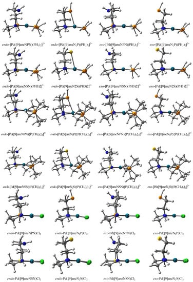 Optimized geometric structures of Pd([9]aneB2A)L2 and Pd([9]aneBAB)L2 types are represented in Figure 1, and their parameters are listed in Table 1. The values of optimized parameters in this study were compared to the values reported previously [17,18,23,37,40,41,42,44,53,54]. In the Pd complexes, the tetracoordinate structures of both the endo- and exo-types of structures were optimized. PdII locates at the center of the tetracoordinate mean plane that is coordinated with a [9]aneB2A (or [9]aneBAB) tridentate and two monodentate ligands. In the case of the endo-[Pd([9]aneB2A)(L-donor)2]2+ with trans L-donor, endo-[Pd([9]aneB2A)(L-donor)2]2+ pentacoordinates with an axial (A--Pd) quasi-bond were stably optimized, and the PdII center lies slightly above the mean plane. The (A--Pd) quasi-bond lengths (RPd…A = 2.782 ~ 2.935 Å) between the axial A site and PdII center are much shorter than the corresponding bonds in the other endo- and exo-Pd tetracoordinates. The optimized structure of endo-Pd([9]aneB2A)Cl2 complex with a trans Cl-acceptor has a tetracoordinate geometry. The distances between the axial A site and PdII center are long (RPd…A = 3.033~3.190 Å). Our values are in agreement with the geometric structures and the apical (soft A…Pd) distances (R(Pd…A) = 3.087~3.293 Å) seen in the previous crystal studies [37,40,41,42].