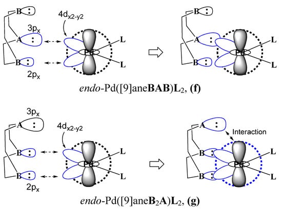 As shown in Figure 2, when the soft A and hard B binding sites simultaneously coordinate to the 4dx2-y2 orbital, the large σ-donor of the A site overlaps more with the 4dx2-y2 orbital than the small σ-donor of B. With increasing atomic size (P:107 pm ≅ S:105 pm >> N:71 pm) [52], the larger σ-orbital of the soft A site in [9]aneBAB first interacts with the 4dx2-y2 orbital on the square-planar plane. In endo-Pd([9]aneBAB)L2 of (f) of Figure 2, due to its atomic size, the bond length (rPd-P = 2.324 ~ 2.225 Å and rPd-S = 2.402 ~ 2.324 Å) of the equatorial (A-Pd) bond is longer than the corresponding (N-Pd) bond (rPd-N = 2.214 ~ 2.094 Å). Two equatorial bond lengths (rPd-A, rPd-B) are unsymmetrical in nature. The axial distance between the axial N site and PdII center is long (rPd-N = 2.720 ~ 3.076 Å). As shown in (g) of Figure 2, in the endo-[Pd([9]aneB2A)(L-donor)2]2+ complex, the average distance between the equatorial N site and PdII center is short (RPd-N = 2.138 ~ 2.195 Å). Because both the equatorial (N-Pd) bonds are short, the large σ-donor of the apical A site closely approaches to the Pd center. Thus, the large σ-donor of the soft A site can interact with the low-lying unoccupied a1g(5s)-orbital of PdL2 complex.