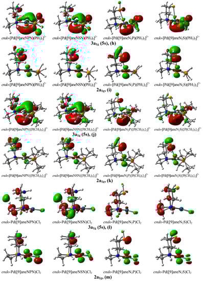 The 3a1g(5s)-orbital [(h), (j), (l)] and 2a1g-orbital [(i), (k), (m)] of endo-Pd([9]aneB2A)L2 and endo-Pd([9]aneBAB)L2 complexes calculated at the B3P86/6-311+G** (lanl2DZ for Pd) level, respectively.