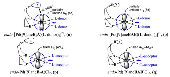 Based on Figure 3, orbital interaction between the σ-donor of the apical soft A (or hard B) site and the partially unfilled a1g(5s)-orbital of PdII center as well as the direction for the electron transfer of trans L-ligand (electron-donor or acceptor) are schematically depicted in Figure 4. In endo-[Pd([9]aneB2A)(L-donor)2]2+ and endo-[Pd([9]aneBAB)(L-donor)2]2+ complexes, the electron density of the unfilled a1g(5s)-orbital of PdII center is greatly increased by the strong electron-donating property of the trans L-donor. The spatial distribution of electron density of the a1g(5s)-orbital is larger than that of the a1g(4dz2)-orbital, thus positioning the lobe of a1g(5s)-orbital at the outer space of the a1g(4dz2)-orbital. As represented in (n) of Figure 4, the soft σ-donor of the axial A site (or substrate of Lewis base) first interacts with the partially unoccupied a1g(5s)-orbital (or Pd-complex of Lewis acid). A fifth apical (soft A--Pd) quasi-bond is formed as shown in Figure 1. In (o) of Figure 4, the size of σ-donor in an axial B site is small [covalent radius of the N atom: 71 pm [52]]. In the regular Pd tetracoordinate, the axially hard N atom cannot easily interact with the Pd center. Meanwhile, in endo-Pd([9]aneB2A)Cl2 and endo-Pd([9]aneBAB)Cl2 complexes with a trans Cl-acceptor, the filled a1g(4dz2)-orbital of PdII center lies spatially outside than that of the a1g(5s)-orbital. There is no interaction between the soft σ-donor of A and the filled a1g(4dz2)-orbital.