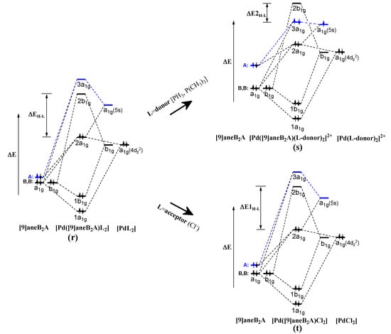The variation in the orbital energy levels of endo-Pd([9]aneB2A)L2 complex, showing the coordination bonds of [9]aneB2A to [Pd(L-donor)2]2+ and [PdCl2]. In endo-[Pd([9]aneB2A)(L-donor)2]2+ complex (r), the separated configuration of two electron spins filled in the 3a1g-orbital indicates the (A--Pd) quasi-bond.