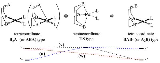 The variation of the structural configuration from endo-Pd([9]aneB2A)L2 {or endo-Pd([9]aneABA)L2} complex to endo-Pd([9]aneBAB)L2 {or endo-Pd([9]aneA2B)L2} complex, including the relative energy level (A:P, S; B:N). (u) is a reaction path from the pentacoordinate endo-[Pd([9]aneB2A)(L-donor)2]2+ complex with an axial (soft A--Pd) quasi-bond to endo-[Pd([9]aneBAB)(L-donor)2]2+. (v) is a reaction path from the tetracoordinate endo-Pd([9]aneB2A)(L-acceptor)2 complex with a trans L-acceptor to endo-Pd([9]aneBAB)(L-acceptor)2. (w) is a reaction path from the endo-Pd([9]anePNP)(L-donor)2 complex to endo-Pd([9]aneP2N)(L-donor)2 without the transition energy barrier.
