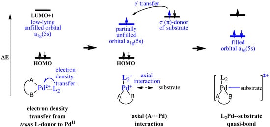 Two-step mechanism for the electron density transfer from an equatorial trans L-donor {PH3, P(CH3)3} and a σ-donor of substrate to a low-lying unoccupied a1g(5s)-orbital of the PdII center.