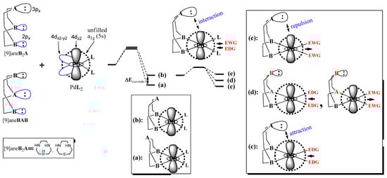 A plausible orbital interaction of an equatorial or axial coordination bond of [9]aneB2A (or [9]aneBAB) with PdL2. (a): exo-type with an apical site pointing to outside. (b): endo-type with an apical site pointing to the Pd center. (c): endo-Pd complex with an apical (A…Pd) attraction. (d): endo-Pd complex without any axial interaction. (e): endo-Pd complex with an apical (A…Pd) repulsion.