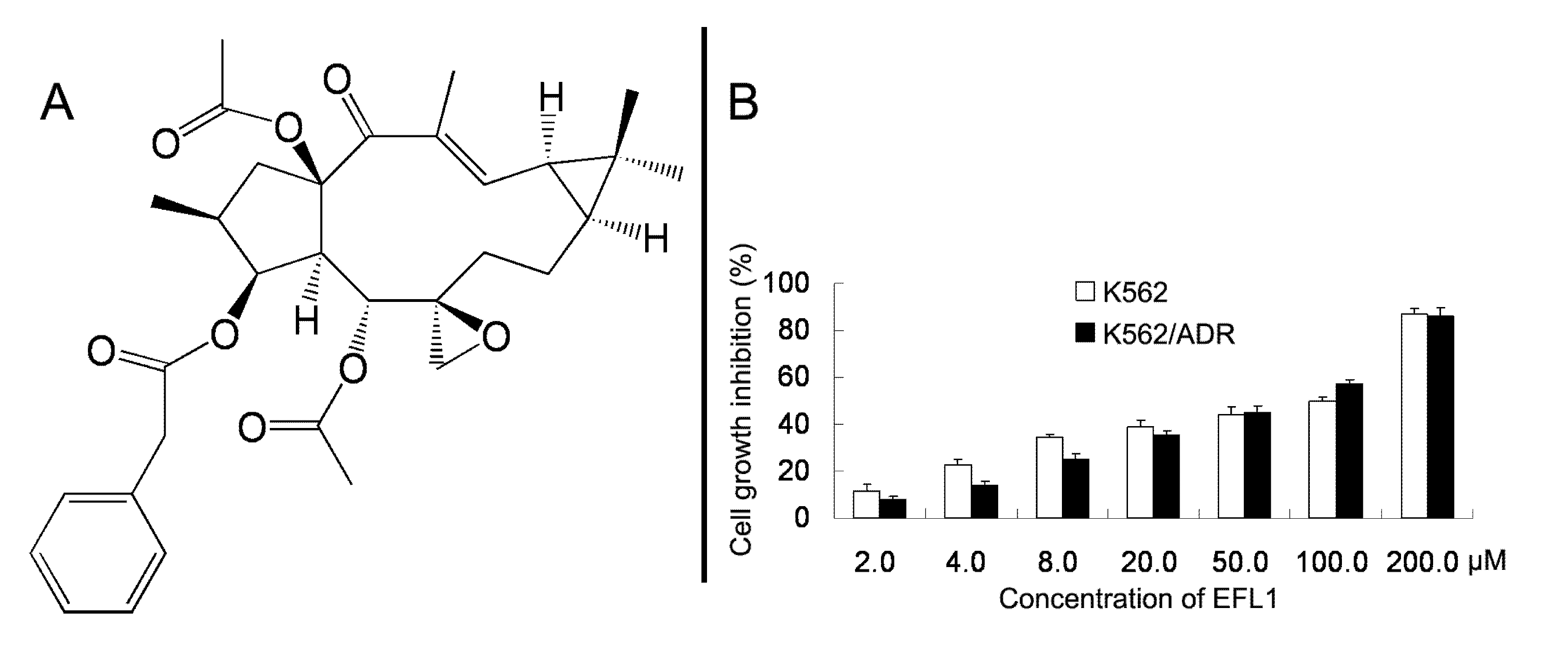 Chemical structure of Euphorbia factor L1 (A) and cell growth inhibition results in K562 and K562/ADR cells (B).