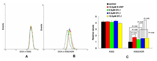 The effect of EFL1 on the accumulation of DOX and Rh 123 was measured by flow cytometry as previously described. Briefly, 5 × 105 cells of K562 or K562/ADR were incubated in 6-well plates and allowed to attach overnight. The cells were treated with indicated concentrations of EFL1 at 37 °C for 3 h. Then 10 μM DOX or 5 μM Rh 123 of final concentration was added and the cells were further cultured for another 3 h or 0.5 h, respectively. Cells were then collected and washed twice with ice-cold PBS buffer. Finally, cells were resuspended in PBS buffer for flow cytometric analysis (BD FASCanto, New York, NY, USA) and 1 × 104 cells were counted for the fluorescence intensity. R-VRP was used as the control inhibitor in the experiments [30].