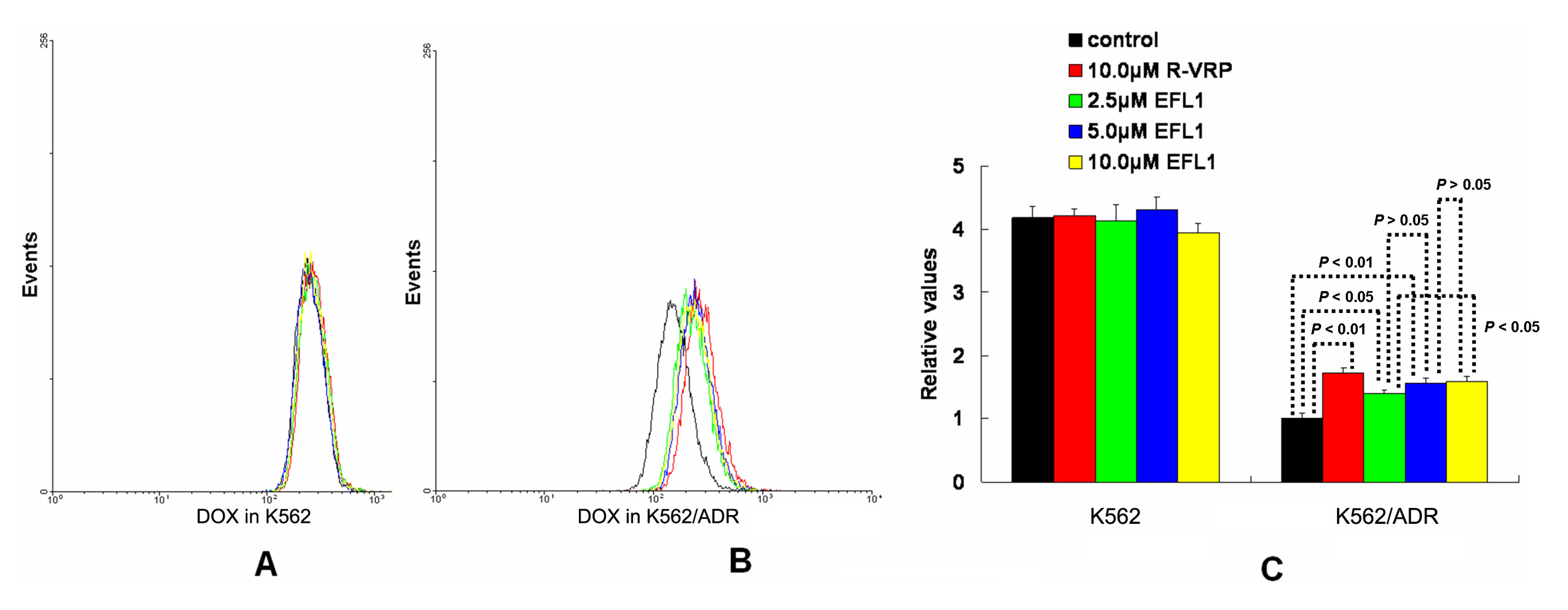 Effects of EFL1 on the accumulation of DOX in K562 and K562/ADR cells. K562 and K562/ADR cells were incubated with 0, 2.5, 5.0 and 10.0 μM EFL1 at 37 °C for 3 h. Then 10 μM DOX of final concentration was added for another 3 h incubation. Intracellular fluorescence was analyzed by flow cytometry with the excitation wave length of 488 nm. R-VRP of 10.0 μM of final concentration was used as the positive control. (A) accumulation of DOX in K562 cells. (B) accumulation of DOX in K562/ADR cells. (C) data analysis of A and B. All experiments were repeated three times. The relative value was calculated by dividing the fluorescence intensity of sensitive or corresponding drug resistance cells by that of the drug resistance cells without treatment of R-VRP or EFL1, respectively. Columns, means of triplicate determinations. * and ** represent significance at p < 0.05 and p < 0.01, respectively.