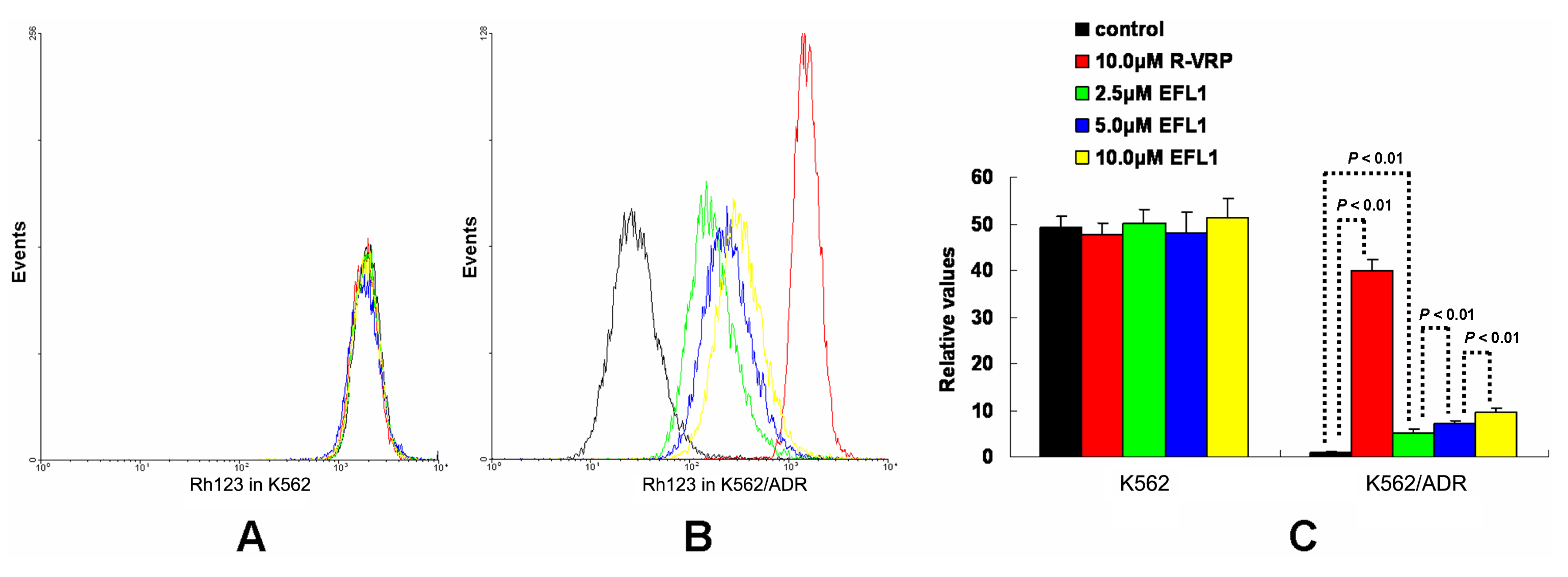 Effects of EFL1 on the accumulation of Rh123 in K562 and K562/ADR cells. Indicated cells were incubated with 0, 2.5, 5.0 and 10.0 μM EFL1 at 37 °C for 3 h. Subsequently, 5 μM Rh123 of final concentration was added for another 0.5 h incubation. Intracellular fluorescence was determined by flow cytometry with the excitation wavelength of 488 nm. R-VRP of 10.0 μM of final concentration was added as the positive control. (A) accumulation of Rh123 in K562 cells. (B) accumulation of Rh123 in K562/ADR cells. (C) data analysis of A and B. All these experiments were carried out for three times. The relative value was calculated by dividing the fluorescence intensity of sensitive or corresponding drug resistance cells by that of the drug resistance cells without treatment of R-VRP or EFL1, respectively. Columns, means of triplicate determinations. * and ** represent significance at p < 0.05 and p < 0.01, respectively.