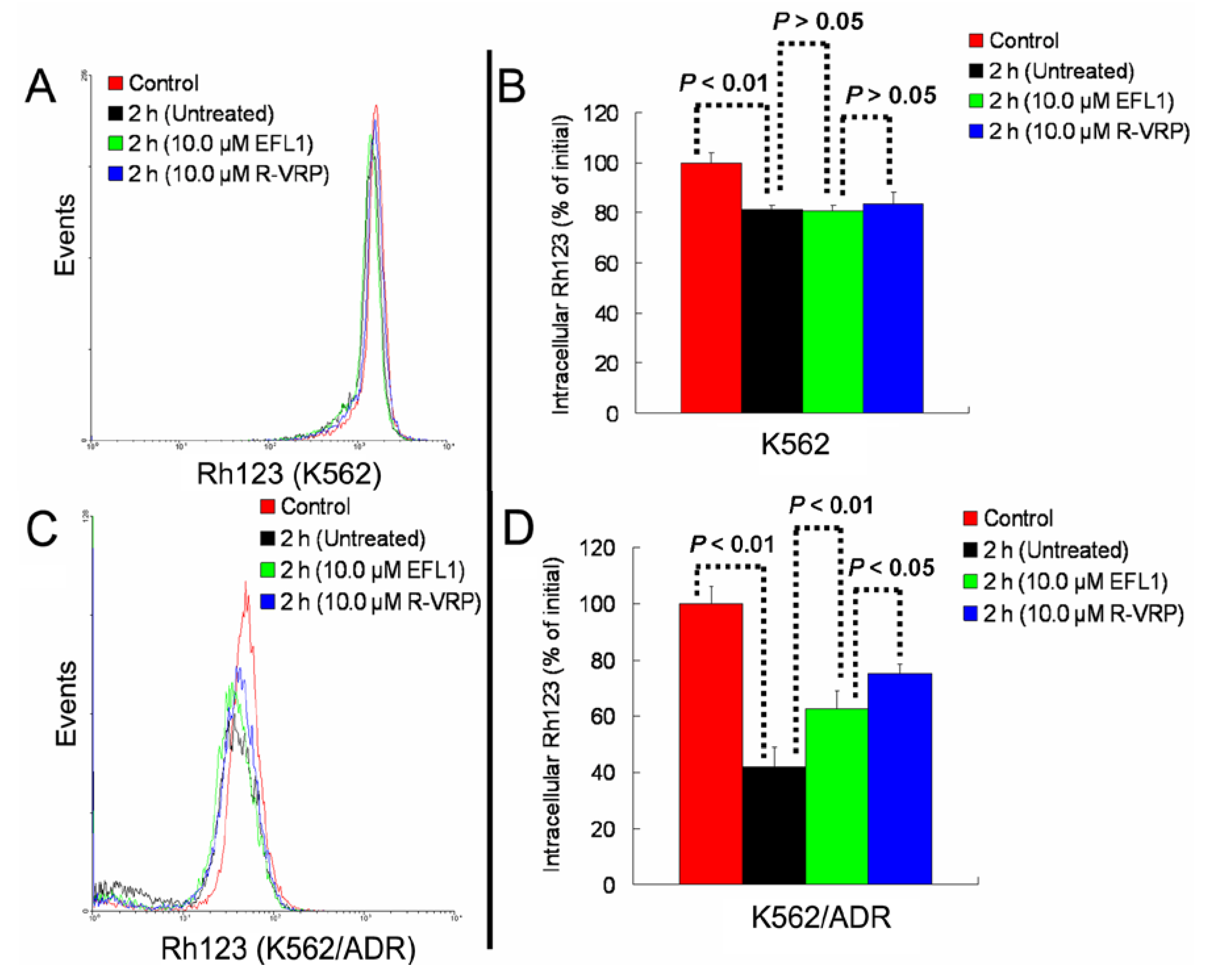 Taken together, Figure 2 and Figure 3 provided support for results of Table 1. Furthermore, our results exhibited that EFL1 inhibited efflux of Rh123 in K562/ADR cells (Figure 4C,D). At the same time, EFL1 did not affect the efflux of Rh123 in K562 cells (Figure 4A,B). In the absence of Rh123, intracellular Rh123 in K562 cells at time of 2 h was 81.16 ± 1.82%, 80.83 ± 2.12% and 83.68 ± 4.47% of control (initial) for group of untreated, 10.0 μM EFL1 and 10.0 μM VRP, respectively. At the absence of Rh123, intracellular Rh123 in K562/ADR cells at time of 2 h was 42.16 ± 6.78%, 62.62 ± 6.34% and 75.33 ± 4.24% of control (initial) for group of untreated, 10.0 μM EFL1 and 10.0 μM VRP, respectively.