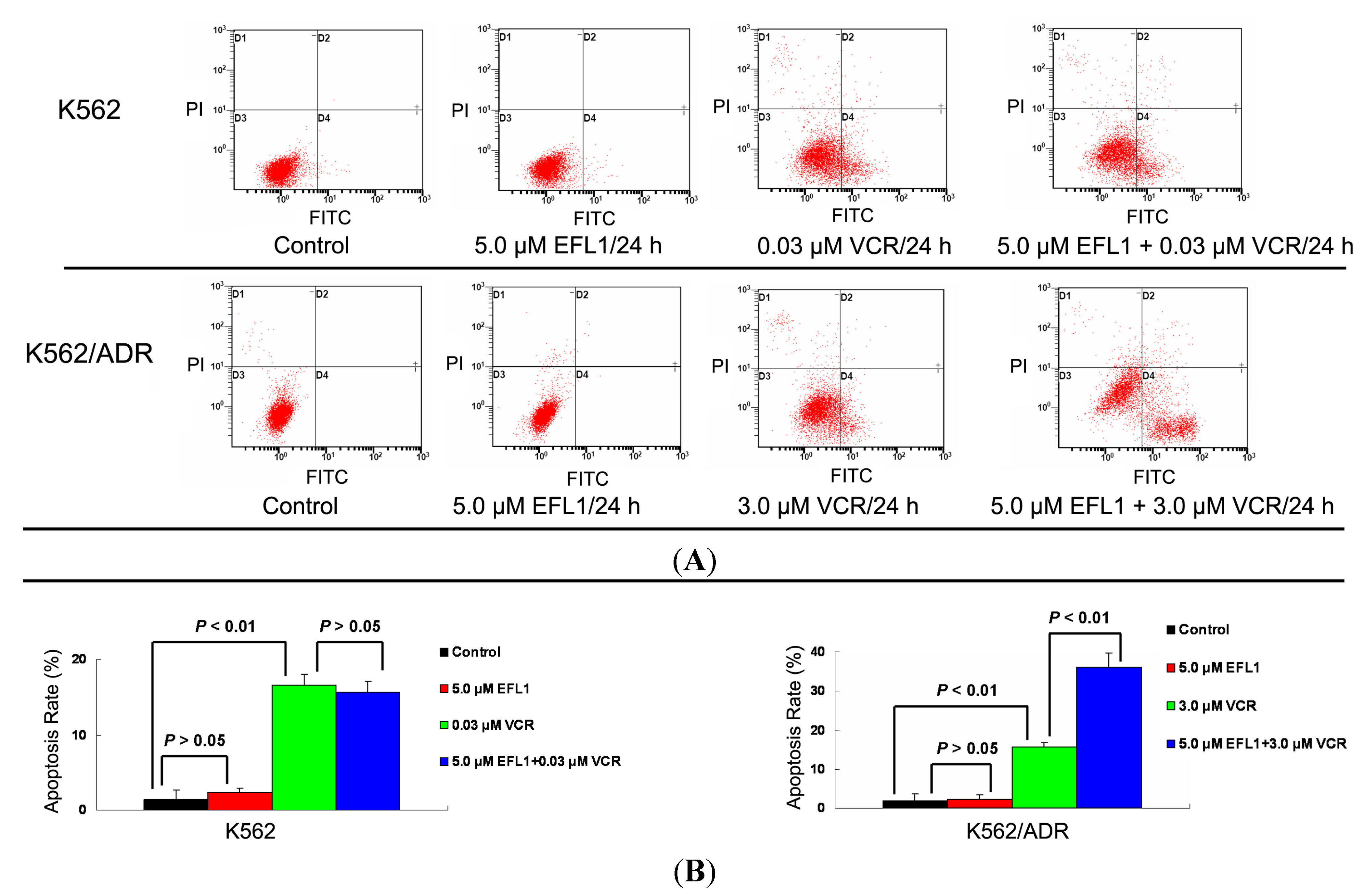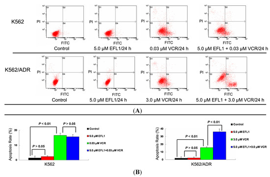 Apoptosis rate was determined by measuring surface exposure of phosphatidylserine in apoptotic cells with Annexin V-FITC/PI apoptosis detection kit according to the manufacturer’s instruction. After K562 and K562/ADR cells were seeded in 6-well plate for 24 h, 0 or 5 μM EFL1 was added to the cells. Three hours later, indicated concentrations of VCR were added to the cells and the culture continued for 24 h. Then, the cells were collected and washed twice with ice-cold PBS. 5 × 105 cells were resuspended with 0.5 mL binding buffer containing Annexin-V (1:50 according to the manufacturer’s instruction) and 40 ng/sample of PI for 30 min at 37 °C in the dark. The number of viable, apoptotic and necrotic cells were quantified by flow cytometer (BD FASCanto) and analyzed by the CellQuest software. At least 10,000 cells were analyzed for each sample. The apoptosis rate (%) = (the number of apoptotic cells/the number of total cells observed) × 100% [31,32].