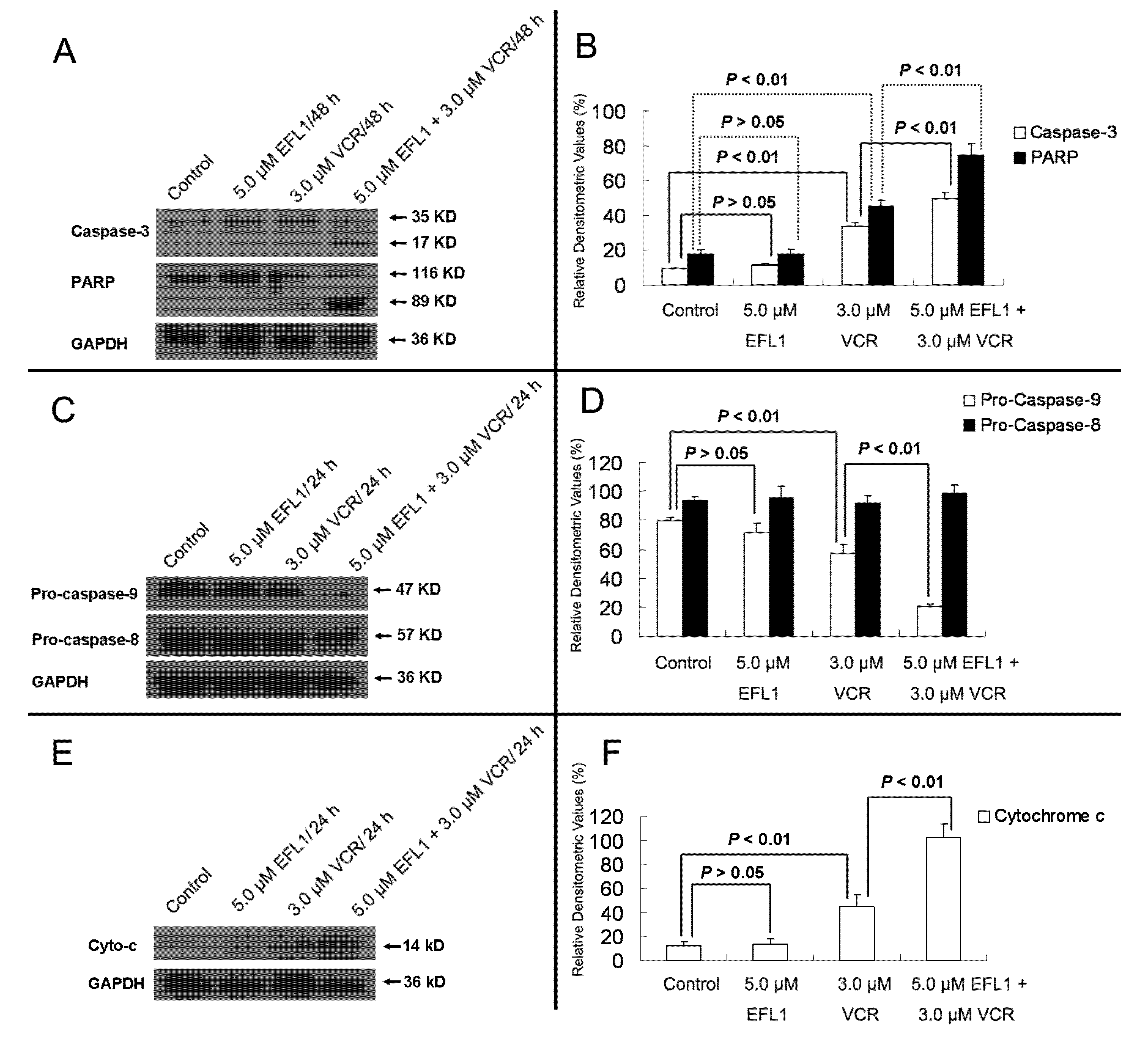 Herein, the apoptosis pathway was further investigated, including detection of Caspase-9 and -8 (Figure 6C,D). The results indicated that activation of Caspase-9 was involved by showing decrease of Pro-Caspase-9 when K562/ADR cells were treated with VCR or VCR+EFL1 (p < 0.01 vs. control). On the other hand, decrease of Pro-Caspase-8 was not observed (p > 0.05 vs. control). It has been reported that activation of Caspase-8 is inhibited by ABCB1 [7], which is consistent with our research. Moreover, release of cytochrome c was detected in our research (Figure 6E,F). After K562/ADR cells were treated for 24 h, Densitometric ratios (%) of cytochrome c/GAPDH were 11.64 ± 4.08%, 13.69 ± 4.50%, 45.17 ± 9.67% and 102.65 ± 11.56% for control, 5.0 μM EFL1, 3.0 μM VCR and 5.0 μM EFL1 + 3.0 μM VCR, respectively. Our results exhibited that EFL1 could significantly enhance release of cytochrome c and then stimulate activation of Caspase-9 (p < 0.01).