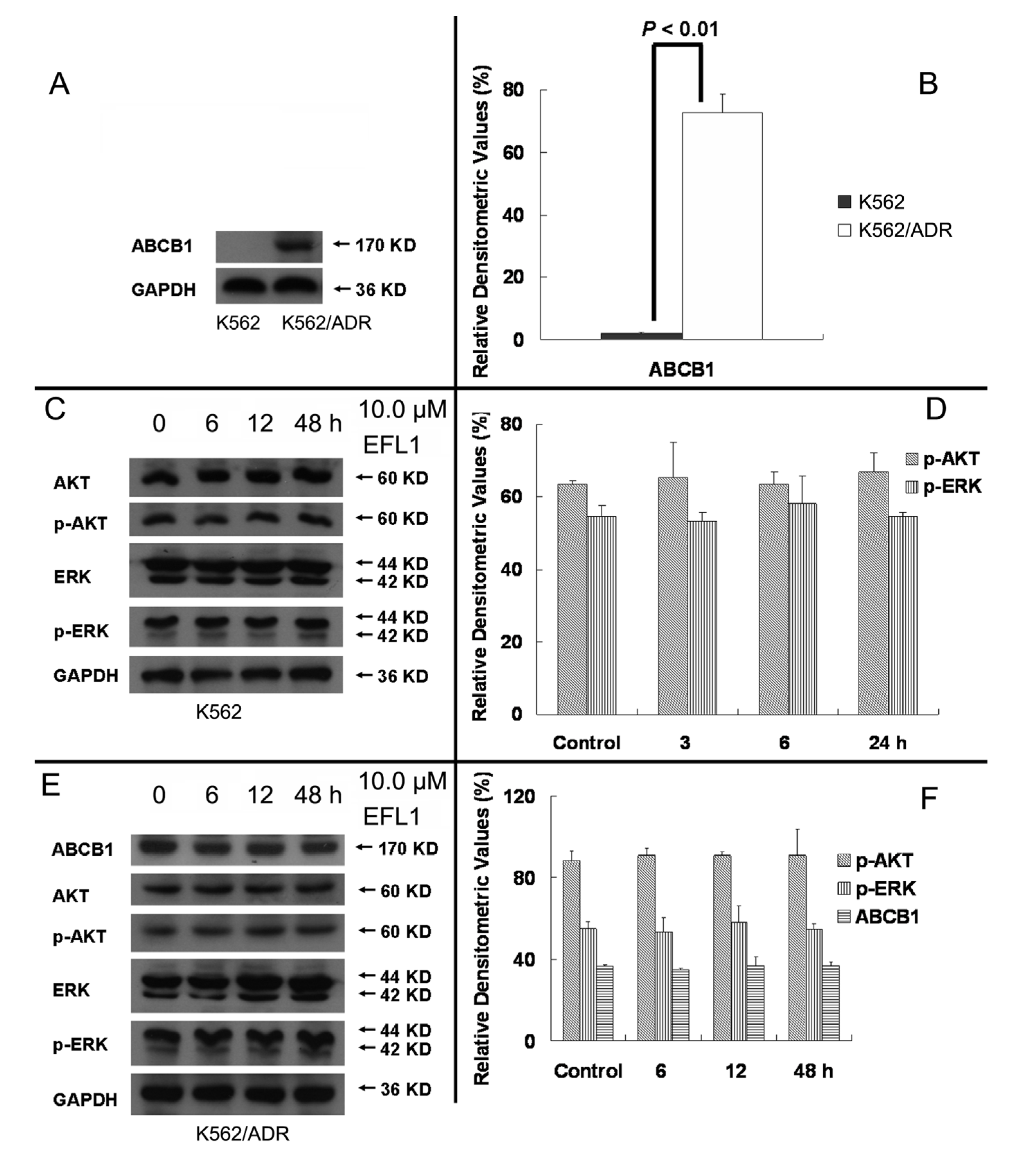 It is notable that EFL1 did not down-regulated expression of ABCB1 in K562/ADR cells (Figure 7E,F). The results showed that the densitometric ratios (%) of ABCB1/GAPDH (Figure 7A,B) in K562 and K562/ADR cells were 3.19 ± 0.87 and 72.71 ± 5.94, respectively (p > 0.01). The densitometric ratios (%) of ABCB1/GAPDH (Figure 7E,F) in K562/ADR cells for 0, 6, 12 and 48 h/10.0 μM EFL1 were 83.42 ± 6.97%, 83.21 ± 1.13%, 84.86 ± 4.55% and 86.34 ± 4.70%, respectively (p > 0.05). The data suggested that ABCB1 expression in K562/ADR was much higher than that in K562 cells. Treatment of EFL1 under concentration of 10.0 μM for 6, 12 or 48 h did not change the expression of ABCB1 in K562/ADR cells.