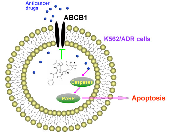 Currently, the most attractive strategy for overcoming MDR is to use sensitizer or reversal agents, which are combined with chemotherapeutic drugs [12]. Great effort has been taken to find reversal agents from natural products [13,14,15]. In our previous study, we have found that lathyrane diterpene Euphorbia factor L1 (EFL1, Figure 1A) from seeds of Euphorbia lathyris, can reverse ABCB1-mediated MDR by inhibiting the efflux function of ABCB1 [16]. In this article, the apoptosis sensitization effect of EFL1 in ABCB1-mediated MDR K562/ADR cells was reported.