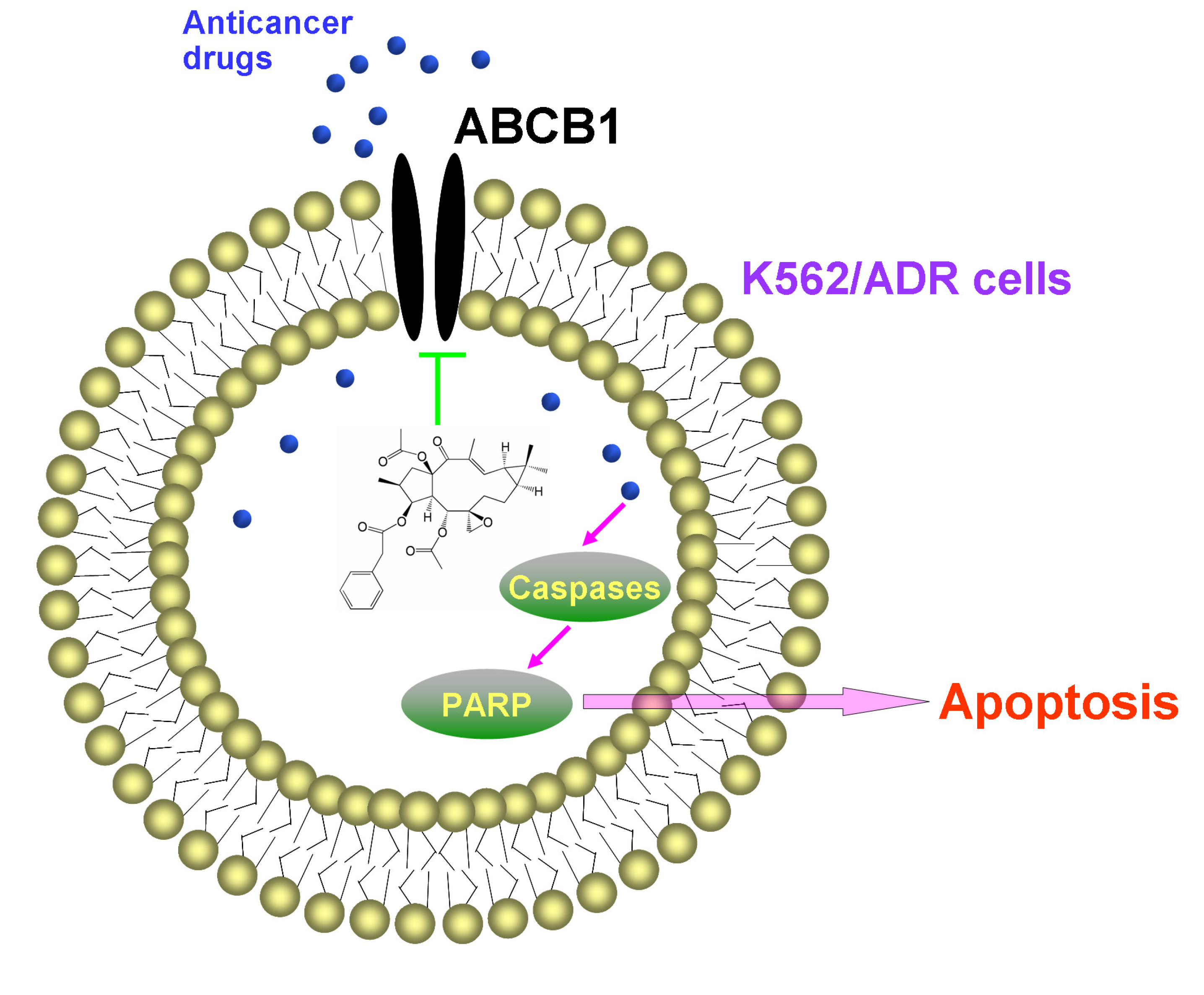 - Zhang, J.Y.; Mi, Y.J.; Chen, S.P.; Wang, F.; Liang, Y.J.; Zheng, L.S.; Shi, C.J.; Tao, L.Y.; Chen, L.M.; Chen, H.B.; et al. Euphorbia factor L1 reverses ABCB1-mediated multidrug resistance involving interaction with ABCB1 independent of ABCB1 downregualtion. J. Cell. Biochem. 2011, 112, 1076–1083. [Google Scholar] [CrossRef]