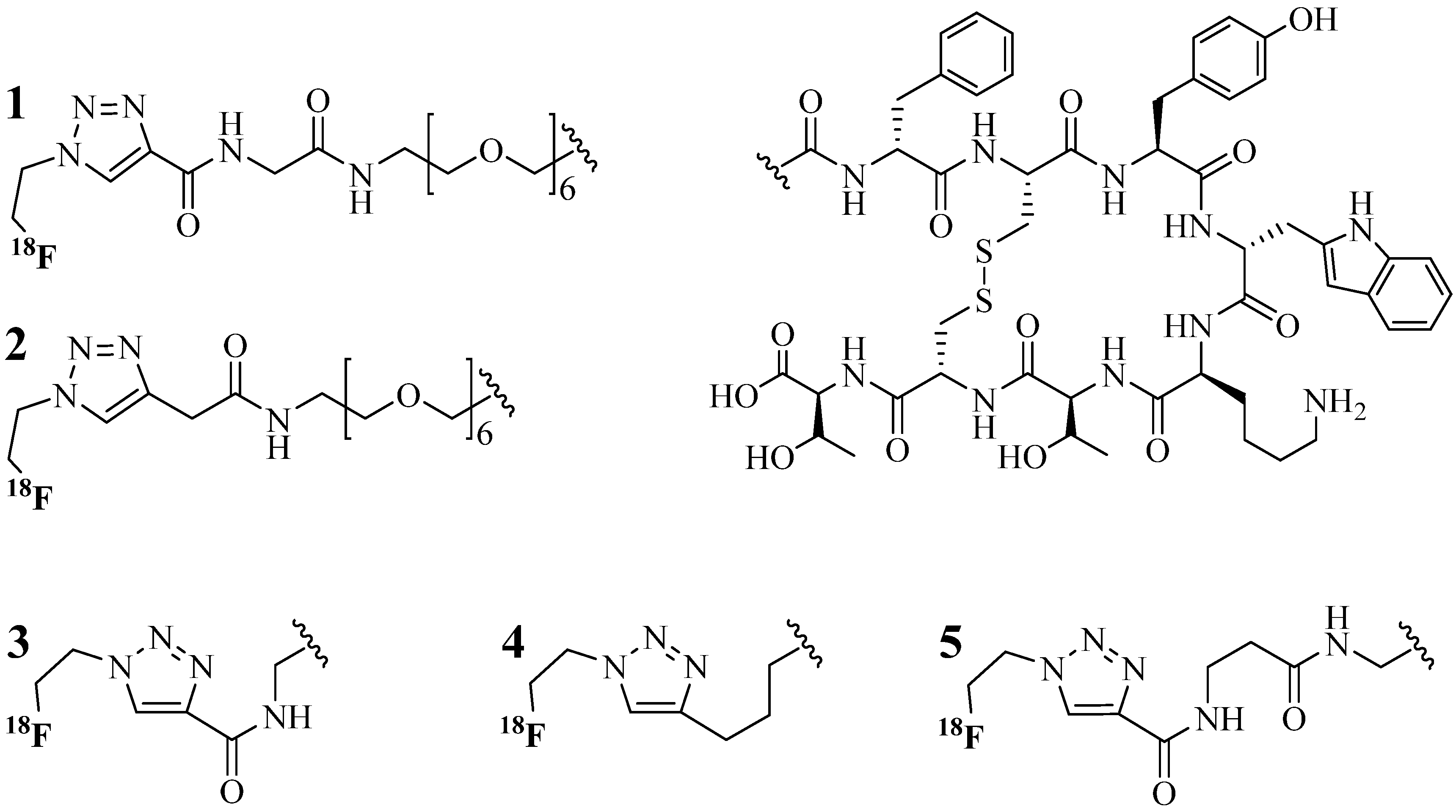 - Iddon, L.; Leyton, J.; Indrevoll, B.; Glaser, M.; Robins, E.G.; George, A.J.T.; Cuthbertson, A.; Luthra, S.K.; Aboagye, E.O. Synthesis and in vitro evaluation of [f-18]fluoroethyl triazole labelled [tyr(3)]octreotate analogues using click chemistry. Bioorg. Med. Chem. Lett. 2011, 21, 3122–3127. [Google Scholar] [CrossRef]