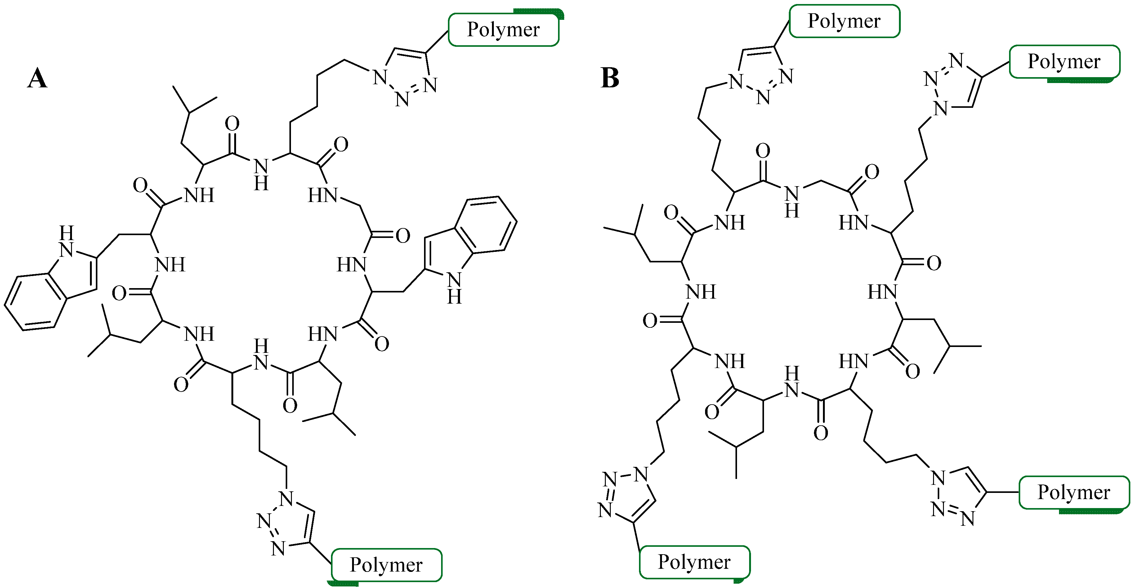 - Poon, C.K.; Chapman, R.; Jolliffe, K.A.; Perrier, S. Pushing the limits of copper mediated azide-alkyne cycloaddition (cuaac) to conjugate polymeric chains to cyclic peptides. Polym. Chem. UK 2012, 3, 1820–1826. [Google Scholar] [CrossRef]