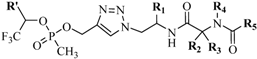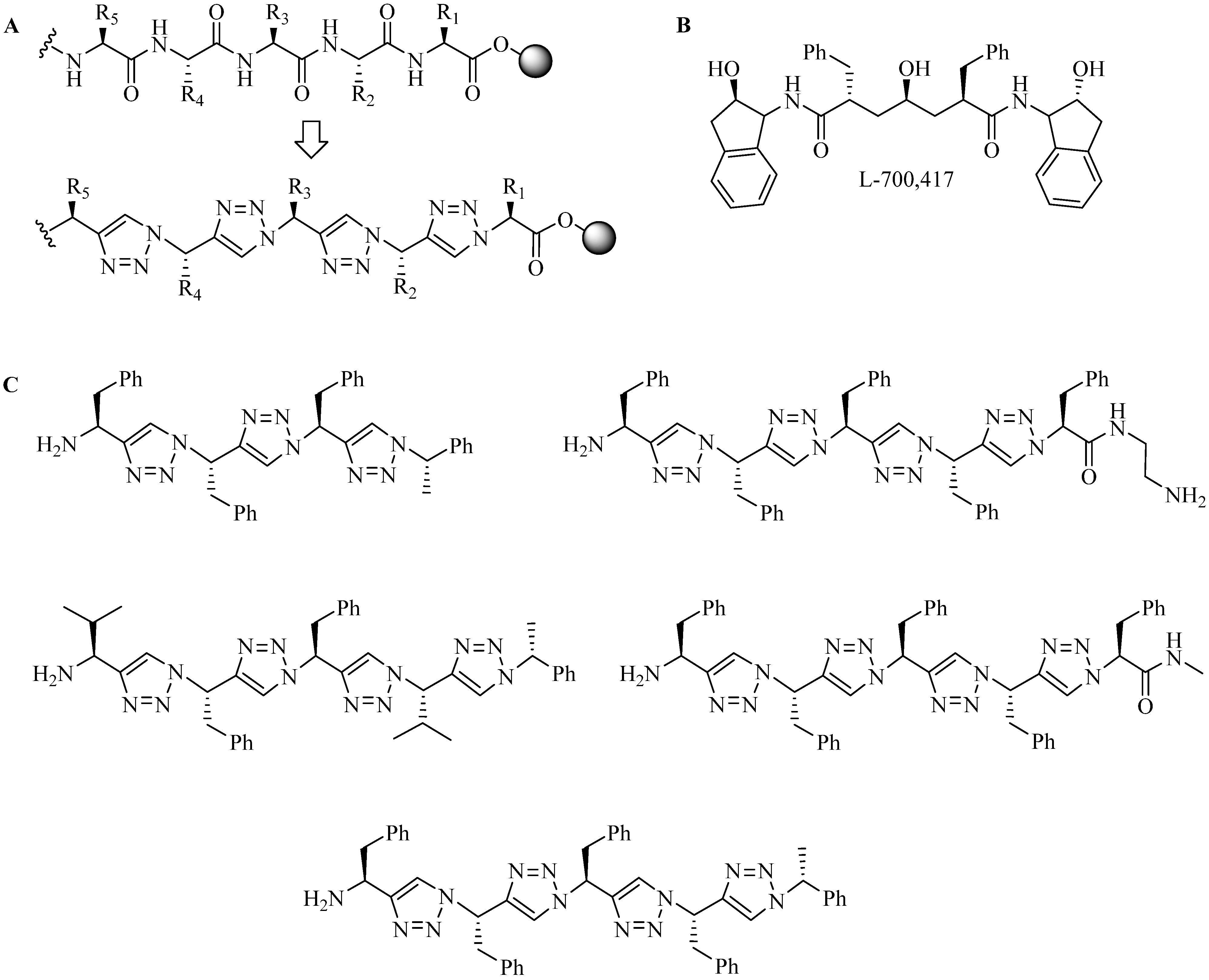 - Jochim, A.L.; Miller, S.E.; Angelo, N.G.; Arora, P.S. Evaluation of triazolamers as active site inhibitors of hiv-1 protease. Bioorg. Med. Chem. Lett. 2009, 19, 6023–6026. [Google Scholar] [CrossRef]
