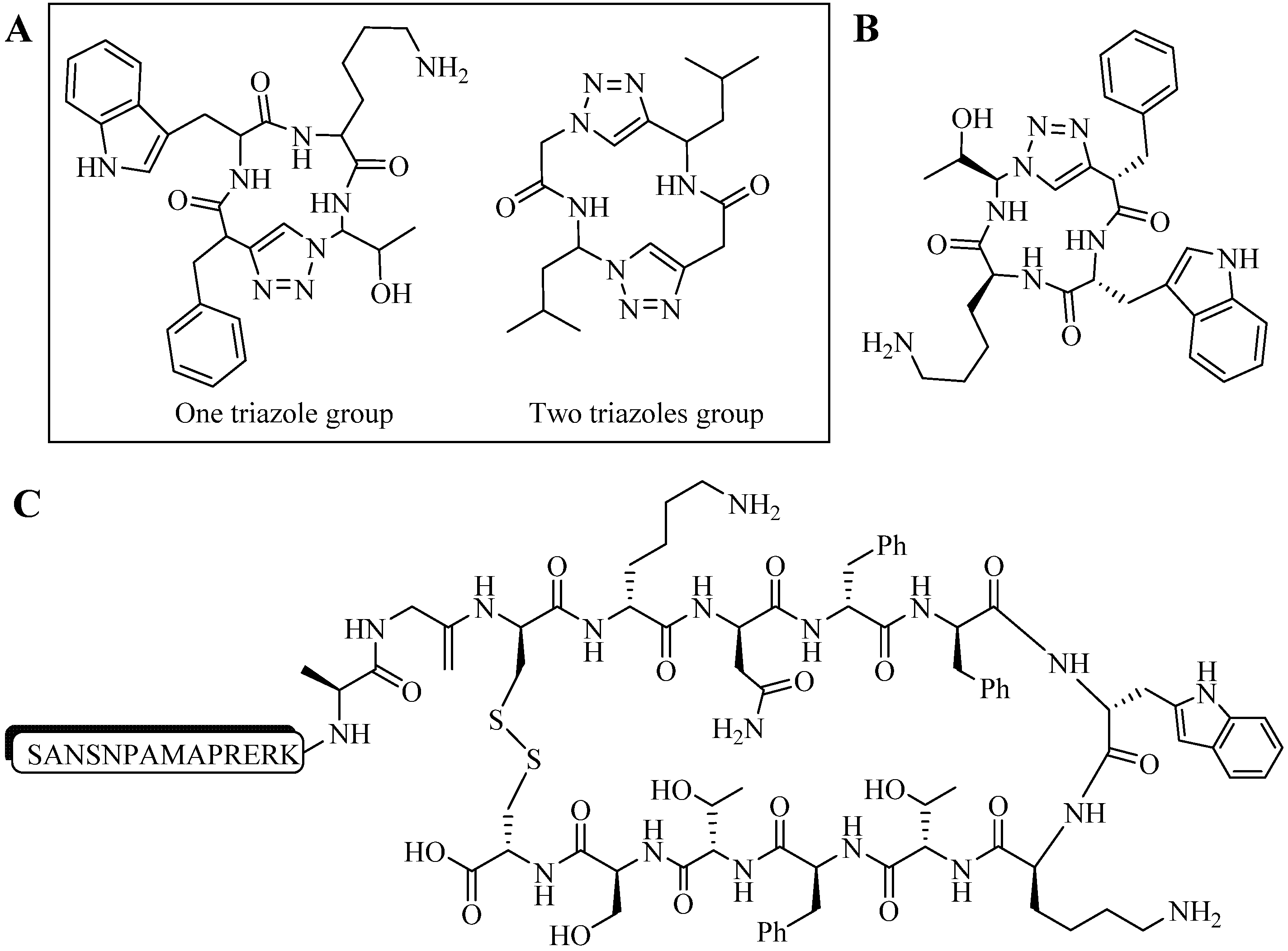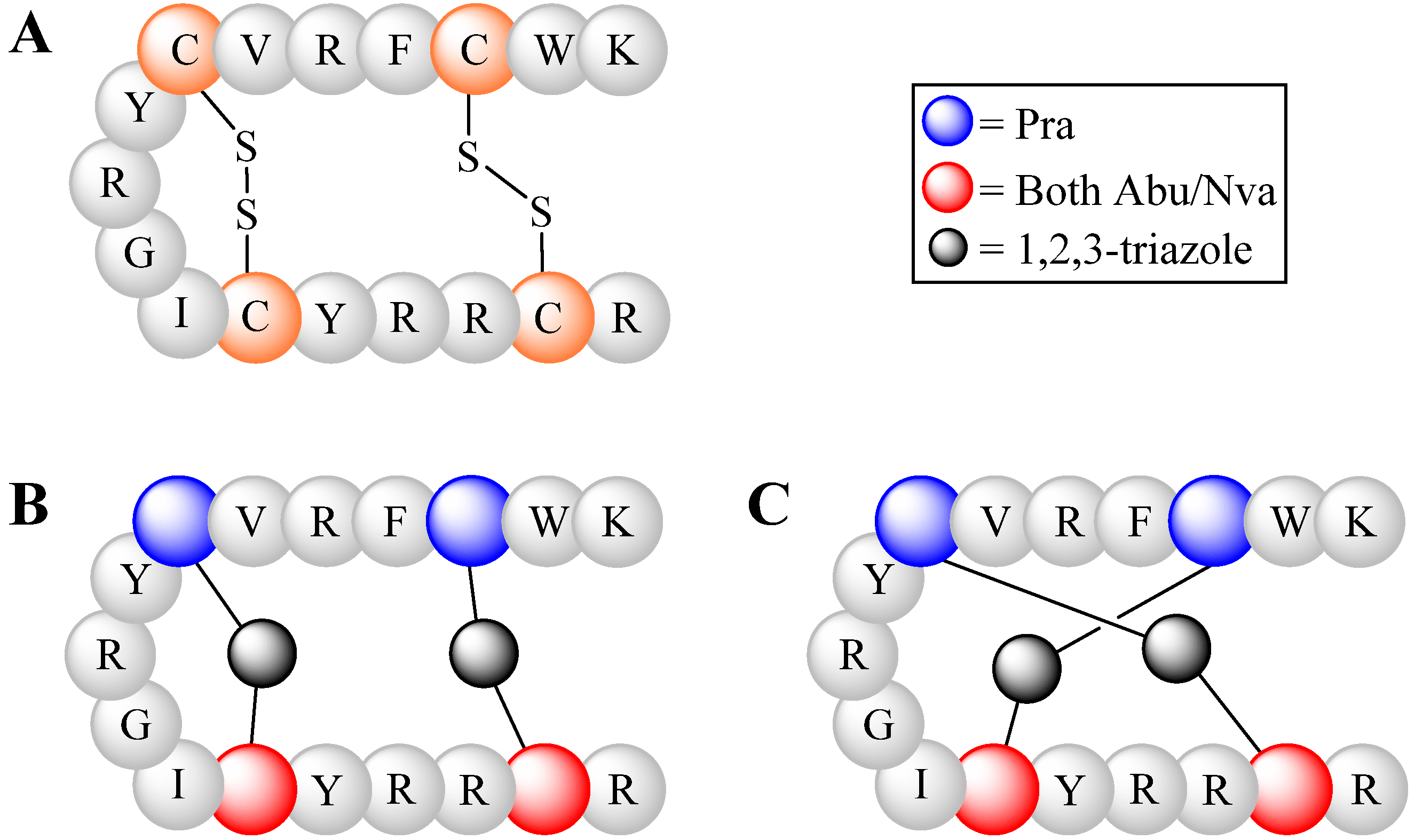 - Park, J.H.; Waters, M.L. Positional effects of click cyclization on beta-hairpin structure, stability, and function. Org.Biomol. Chem. 2013, 11, 69–77. [Google Scholar] [CrossRef]