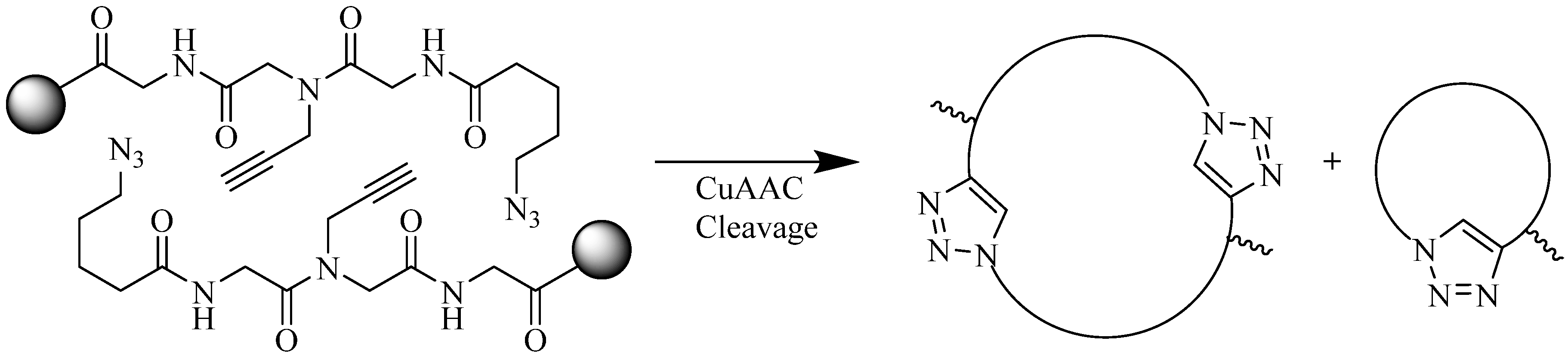 - Angelo, N.G.; Arora, P.S. Solution- and solid-phase synthesis of triazole oligomers that display protein-like functionality. J. Org. Chem. 2007, 72, 7963–7967. [Google Scholar] [CrossRef]