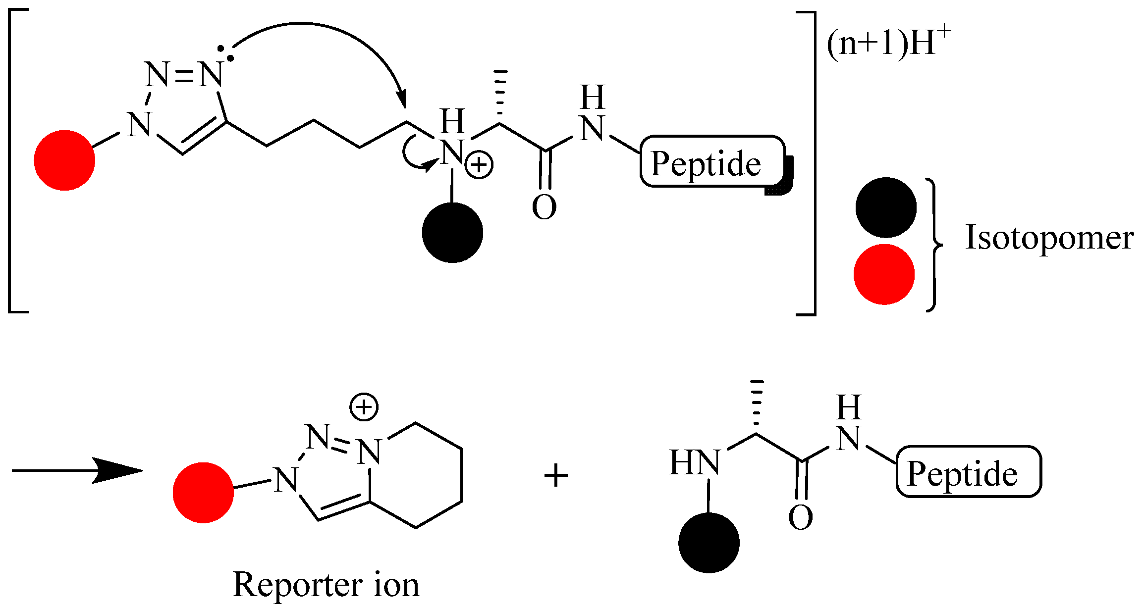 - Sohn, C.H.; Lee, J.E.; Sweredoski, M.J.; Graham, R.L.; Smith, G.T.; Hess, S.; Czerwieniec, G.; Loo, J.A.; Deshaies, R.J.; Beauchamp, J.L. Click chemistry facilitates formation of reporter ions and simplified synthesis of amine-reactive multiplexed isobaric tags for protein quantification. J. Am. Chem. Soc. 2012, 134, 2672–2680. [Google Scholar] [CrossRef]