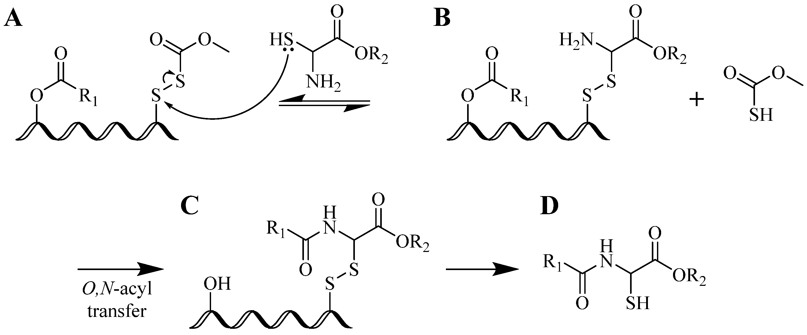 - Kemp, D.S.; Leung, S.L.; Kerkman, D.J. Models that demonstrate peptide-bond formation by prior thiol capture.1. Capture by disulfide formation. Tetrahedron Lett. 1981, 22, 181–184. [Google Scholar]
