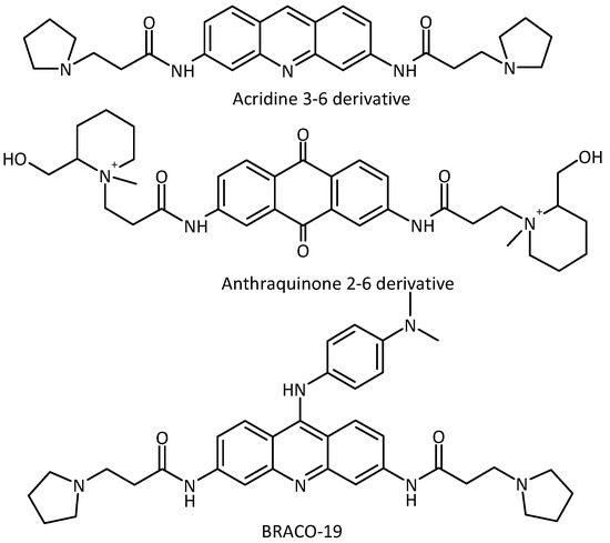 Examples of anthraquinone and acridine derivatives known as DNA G-quadruplex DNA G-quadruplex ligands.