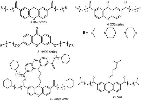 Also in this instance, on the basis of the data reported in Table 4, there is clearly higher activity for dimeric and three side chains derivatives compared to other series of xanthene and xanthone derivatives.