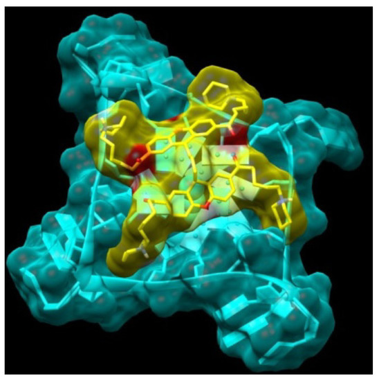 Model obtained for the complex between the XA3c (14), yellow atom-type) and the monomeric G-quadruplex (light blue).