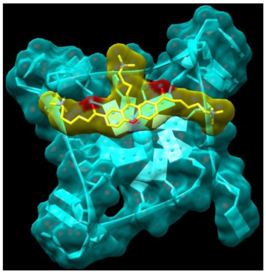 In view of the findings from earlier studies that the introduction of an appropriate third substituent arm enhances selectivity (for instance trisubstituted triazines, porphyrins, and acridines such as BRACO-19), we considered it appropriate to introduce a third chain on the xanthone core, using the knowledge already acquired from the two-chain templates [13,30]. The calculated binding energy of compound XA3c (14) looks promising. The interaction of this compound is predicted with the telomeric quadruplex to show the positively charged side chains in position 3 and 6 each extending into a wide groove, while the side chain in position 9 inserts into a narrow hydrophobic pocket (Figure 5).
