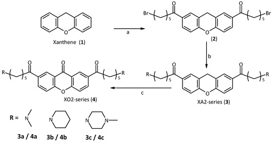 Following the molecular modelling studies, the aim of our work became the synthesis of xanthene and xanthone derivatives appropriately modified in order to improve aqueous solubility and ability to interact with the target quadruplex. We started from xanthene itself, which is commercially available. The first step in the strategy was to introduce the side-chains by Friedel-Crafts acylation. In this way, the 2,7-positions were functionalized. We employed chains of suitable length which are also very flexible, to be in optimal contact with the quadruplex backbones and grooves [31]. Since these chains terminate with a bromine atom, suitable for the subsequent nucleophilic substitution, using different amines, similar to those used for this purpose in the literature, we obtained a small library of compounds such as XA2 dma, pip and mpz (3a,b and c, Scheme 1) [32,33]. The secondary amines we used become tertiary after substitution and are charged under physiological conditions. To increase the planarity of the molecule, we decided to oxidize the methylene group of the xanthene to a carbonyl group with Jones reactant, obtaining the corresponding xanthone derivatives XO2 dma, pip and mpz (4a,b and c, Scheme 1).