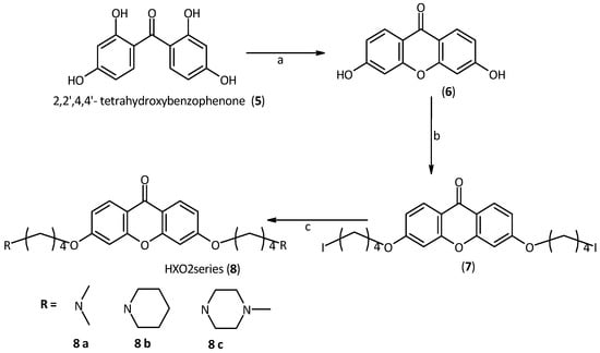 Regarding the synthesis of the second generation of derivatives (HXO2 dma, pip and mpz, 8a,b and c) we had to synthesize the xanthone core, because the 3 or 6 positions of this core are deactivated. The starting-point was 2,2',4,4'-tetrahydroxybenzophenone, which was dehydrated by generating a xanthone core with two hydroxyl groups in the desired 2 and 7 positions. This reaction is quantitative and occurs only under high temperature and pressure conditions. To carry out this dehydration, the starting material was suspended in a sealed steel tube half-filled with water. At 250 °C, the water evaporation generates the necessary pressure (about 50 atm) to promote the reaction [34] Then, side chains of suitable length were introduced, using 1,4-diidodoproane. As in the previous series of compounds, the second halogen was replaced with the desired amine. Piperidine, methylpiperazine and dimethylamine were used as amines to obtain a small library of derivatives, Scheme 2.
