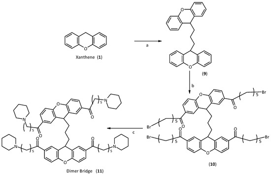 The first step in the synthesis of the bridge dimer 11 was the creation of the bridge between the two xanthene moieties. This reaction first requires generation in situ of the corresponding carbanion, and then the addition of a stoichiometric amount of 1,3-diiodopropane. At this point, the synthesis was performed as for the first generation of xanthene. Therefore, a Friedel Craft acylation was carried out on the two positions 2 and 7, and finally the subsequent nucleophilic substitution with the amine, Scheme 3.
