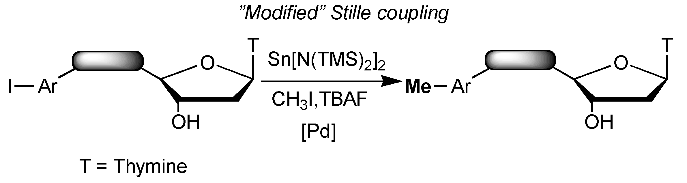 Starting from thymidine aldehyde, we have synthesized 5'C-substituted thymidine derivatives either with alkyne or azide groups and then engaged them into a conjugation reaction with iodoaryl moieties by “click chemistry’’ leading to compounds 1a–c (Figure 1) [16]. They were then used as substrates for the methyl transfer study. The monomethyltin reagent was prepared from iodomethane and Lappert’s stannylene [17,18] (Sn[N(TMS)2]2) and activated in situ with TBAF (tetrabutylammonium fluoride) giving the corresponding methylstannate, according to the previously described procedure [12].