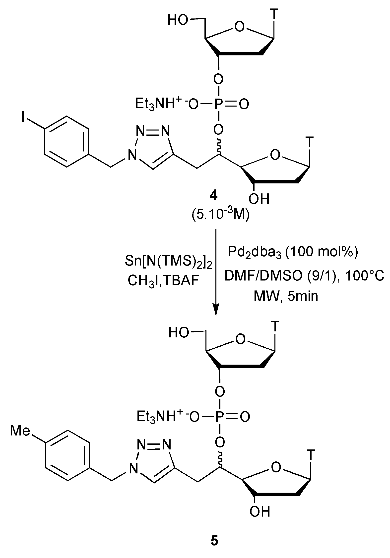 However, addition of 10% DMSO in DMF, under classical heating led to an increased formation of the hydrogenated product 3b (34%) together with apparition of side products (entry 5), while microwave heating, under the same conditions (entry 6), allowed us to get a clean reaction with a 96/4 2b/3b ratio. The increase of the proportion of DMSO under microwaves (entry 7), led to an almost similar 2b/3b ratio. The use of H2O instead of DMSO, even in a very small quantity, under classical heating, seriously disturbed the rate of the reaction and the formation of the methylated compound (entry 8). The use of microwaves in the same conditions allowed us to recover a total conversion in 5 min with quite a good 2b/3b ratio (entry 9). Finally, even a slight increase of the proportion of H2O was not appropriate at all (entry 10). After the achievement of the procedure optimization on the monomeric substrates, the last step was to test our best conditions on the dinucleotide 4 synthesized as a 70/30 mixture of diastereomers according to the standard phosphoramidite method from the 5'C-substituted nucleoside from 1b [19,20].