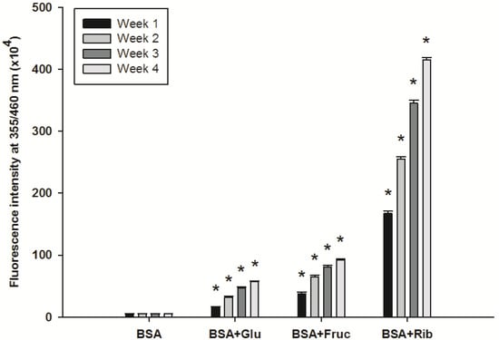 As shown in Figure 1, the fluorescence intensity of AGEs in BSA incubated with three types of monosaccharides during four weeks significantly increased throughout the incubation period. At week 4, the fluorescence intensity of glucose-, fructose-, and ribose-glycated BSA was 10.71-, 17.22-, and 77.23-fold higher than control non-glycated BSA. Protein glycation is a spontaneous reaction between monosaccharides and proteins that produces unstable Schiff bases that form Amadori products such as fructosamine, which is clinically used as an indicator for short-term control of blood sugars in diabetic patients [1,2]. This reaction generates irreversible heterogeneous products termed advanced glycation end products (AGEs) [2]. The rate of glycation is dependent on the concentration and type of monosaccharide [9,10]. All three monosaccharides exhibited protein cross-linking effects with different potency (glucose < fructose < ribose). Previous studies revealed faster accumulation of protein-bound fluorescence and oligomerization with fructose than glucose [16]. Moreover, the glycating ability of monosaccharides occur in the following increasing order: d-glucose < d-mannose < d-galactose < d-xylose < d-fructose < d-arabinose < d-ribose < 2-deoxy-D-ribose [17]. The highest glycating capability of d-ribose is explained by its planar structure causing the unstable aldofuranose ring to react with the amino groups [10].