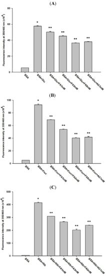 | BSA+Fruc+FA 5 mM | 0.79 ± 0.02 | 1.41 ± 0.03 ** |