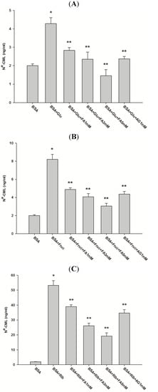 | BSA+Glu+AG 1 mM | 0.88 ± 0.02 ** | 1.16 ± 0.06 ** |