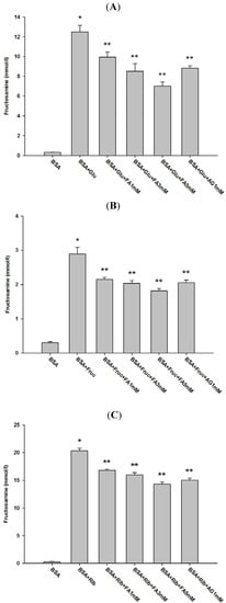 | BSA+Fruc+FA 1 mM | 0.70 ± 0.03 | 1.88 ± 0.04 ** |