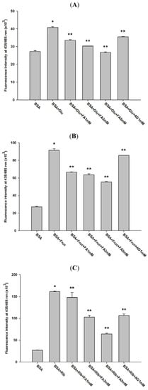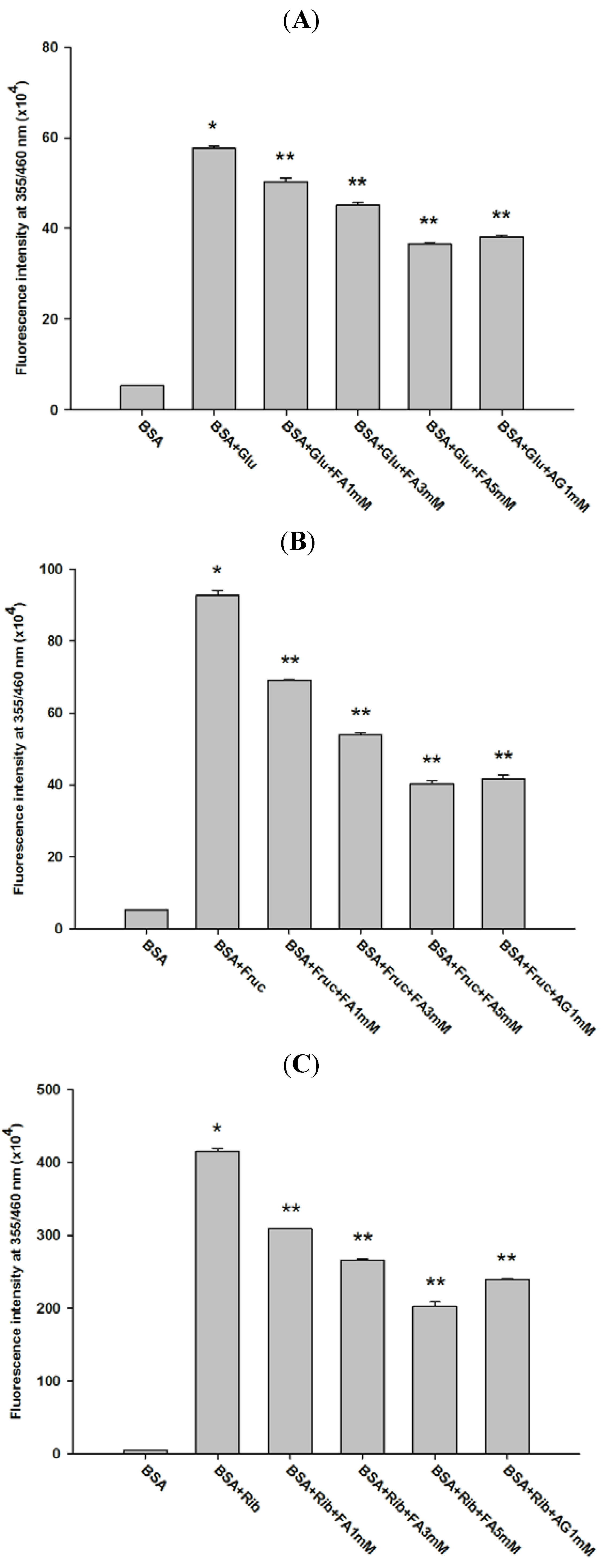 Effect of FA on the fluorescence intensity of BSA incubated with glucose (A), fructose (B), and ribose (C) at week 4. The results are expressed as mean ± SEM (n = 3). * p < 0.05 when compared to BSA, ** p < 0.05 when compared to BSA+glucose, BSA+fructose or BSA+ribose. AG was used as positive control.