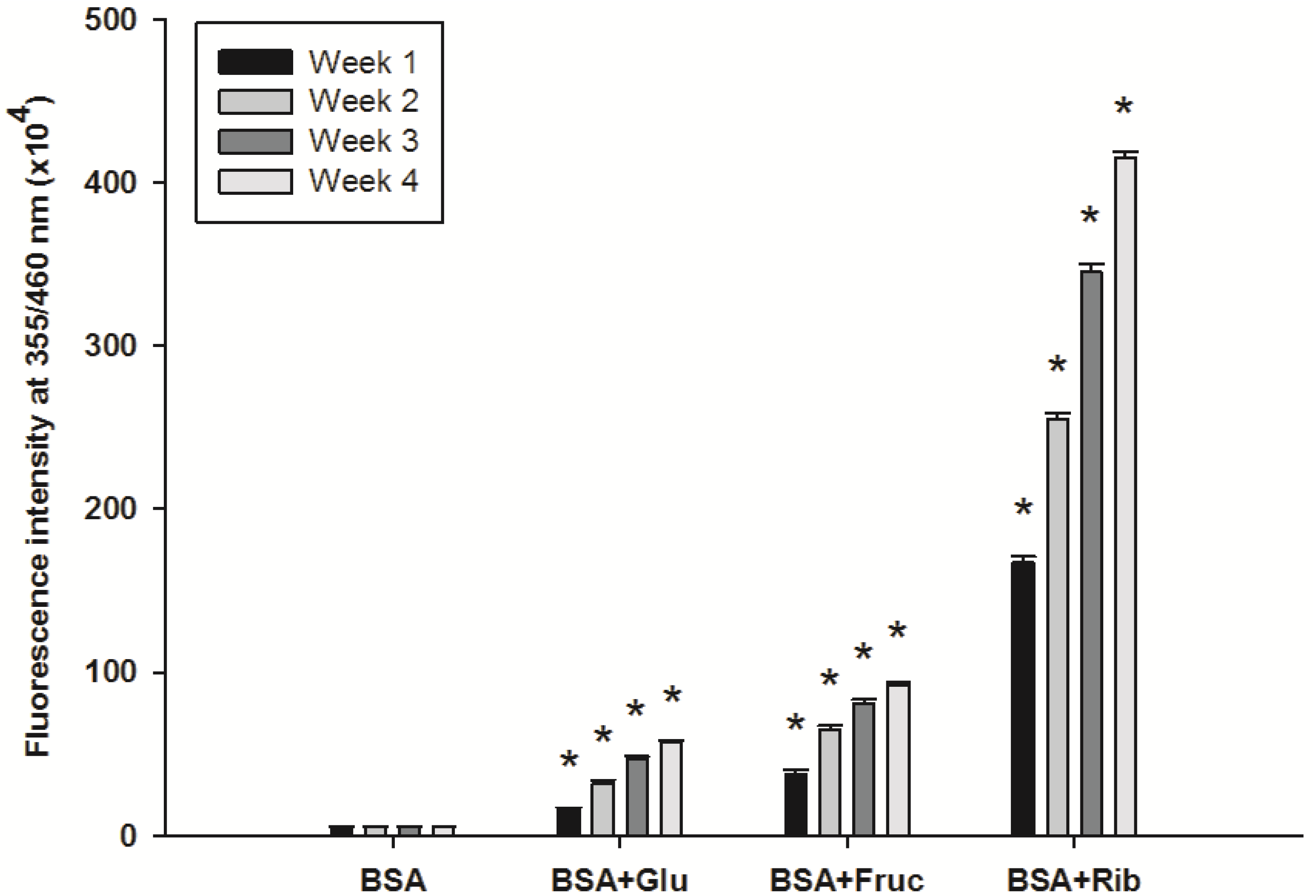 As shown in Figure 4, the level of fructosamine in BSA incubated with glucose, fructose, and ribose increased by 41.57-, 9.59-, and 68.12-fold respectively compared to non-glycated BSA. The results demonstrated that ribose exhibited the highest rate of fructosamine production among the three monosaccharides. When comparing the effect of fructose and glucose on protein glycation, many reports describe that fructose has greater capability to form fluorescent and non-fluorescent AGEs than glucose [24,25]. Consequently, this may suggest that fructose is much more prone to produce the Amadori product (fructosamine) than glucose. However, in our study, the level of fructosamine in fructose-glycated BSA was lower than in glucose-glycated BSA.