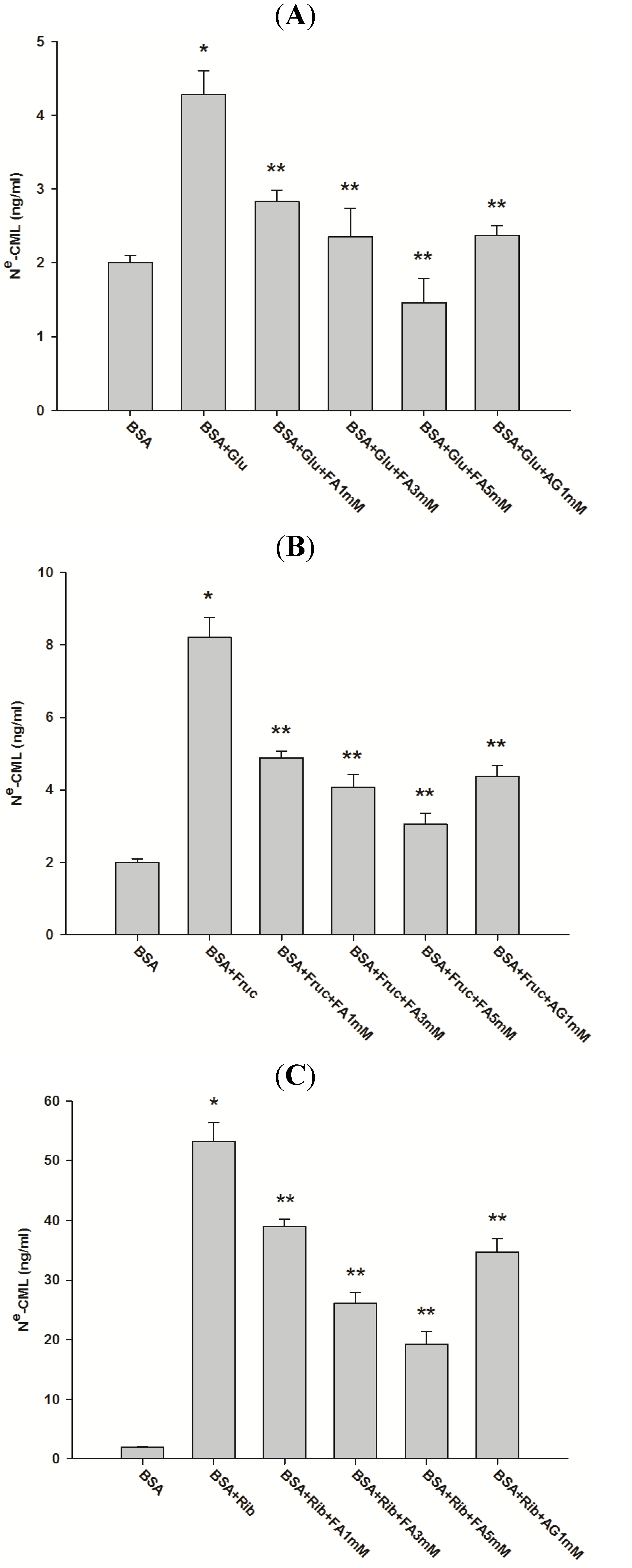 Effect of FA on non-fluorescence AGEs level (Nε-CML) in BSA incubated with glucose (A), fructose (B) and ribose (C) at week 4. The results are expressed as mean ± SEM (n = 3). * p < 0.05 when compared to BSA, ** p < 0.05 when compared to BSA+glucose, BSA+fructose or BSA+ribose. AG was used as positive control.