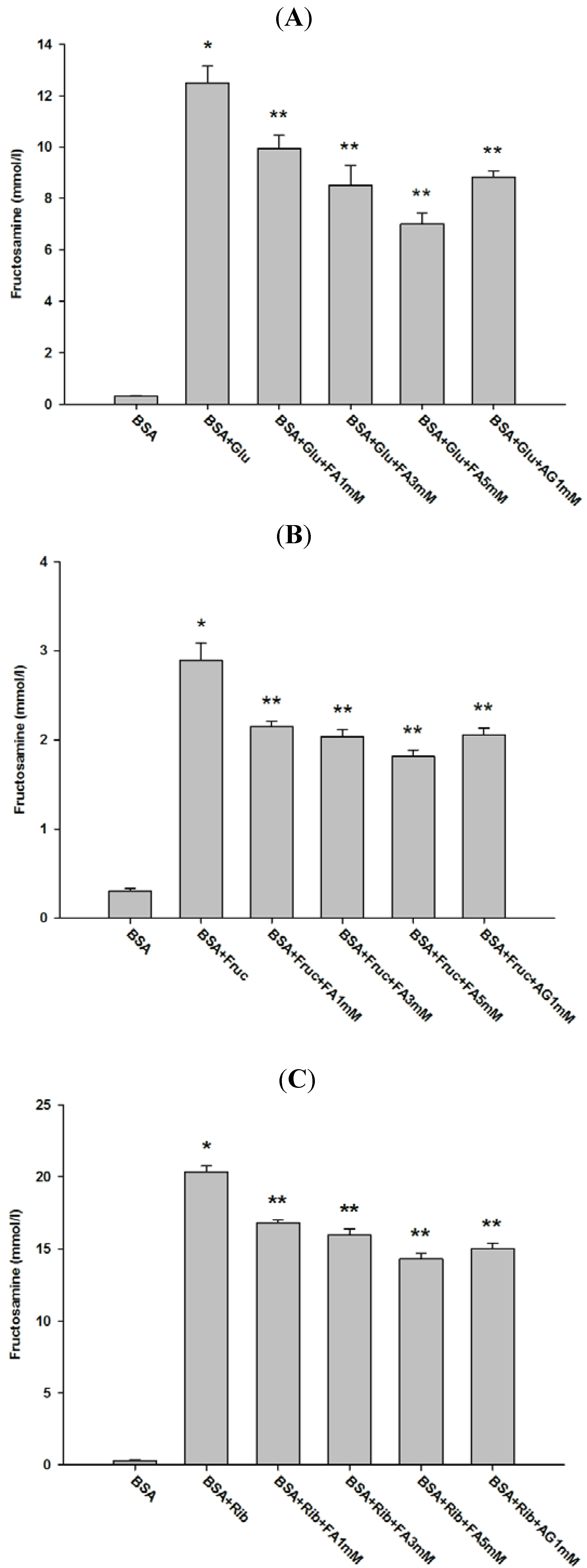 Effect of FA on fructosamine level in BSA incubated with glucose (A), fructose (B) and ribose (C) at week 4. The results are expressed as mean ± SEM (n = 3). * p < 0.05 when compared to BSA, ** p < 0.05 when compared to BSA+glucose, BSA+fructose or BSA+ribose. AG was used as positive control.